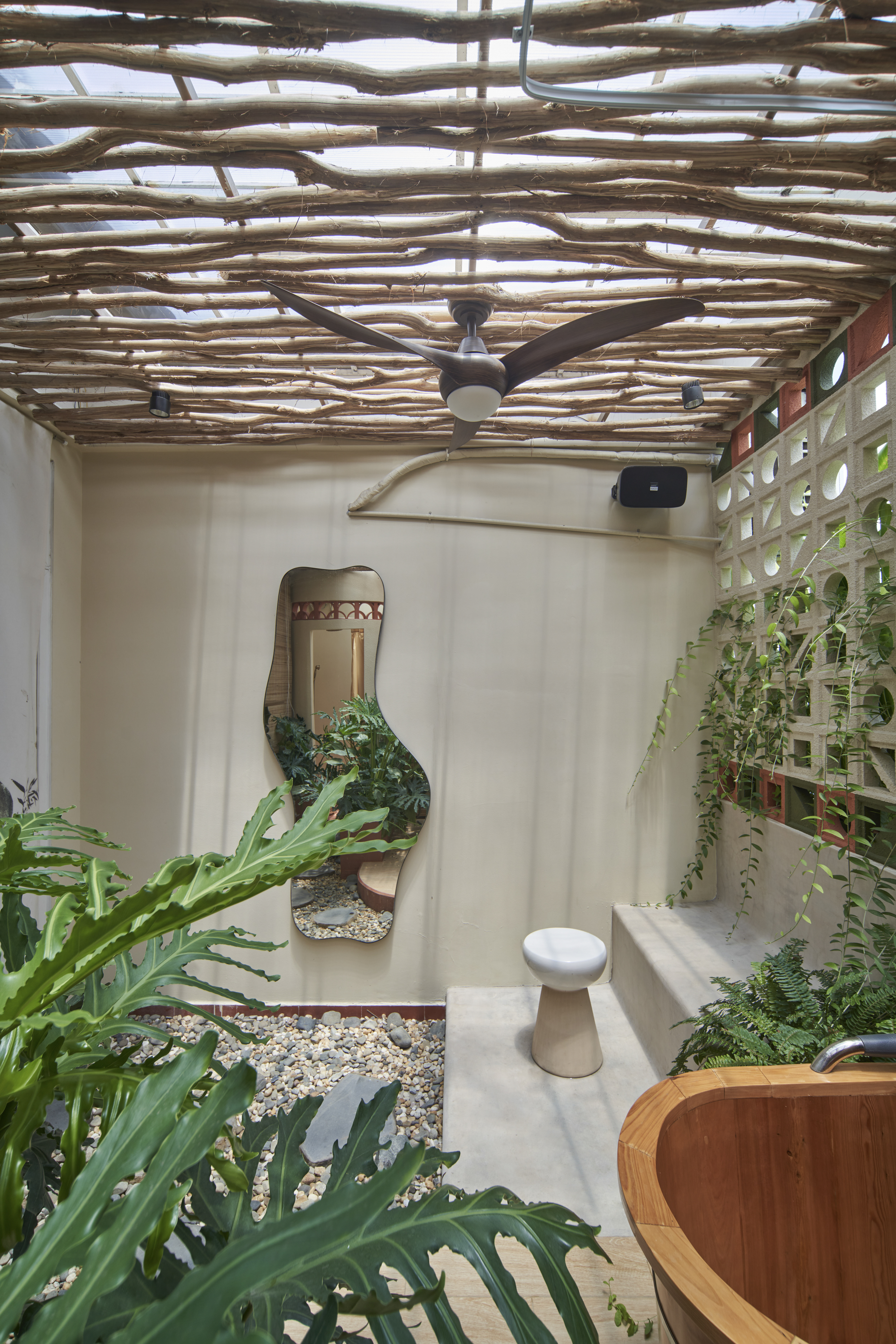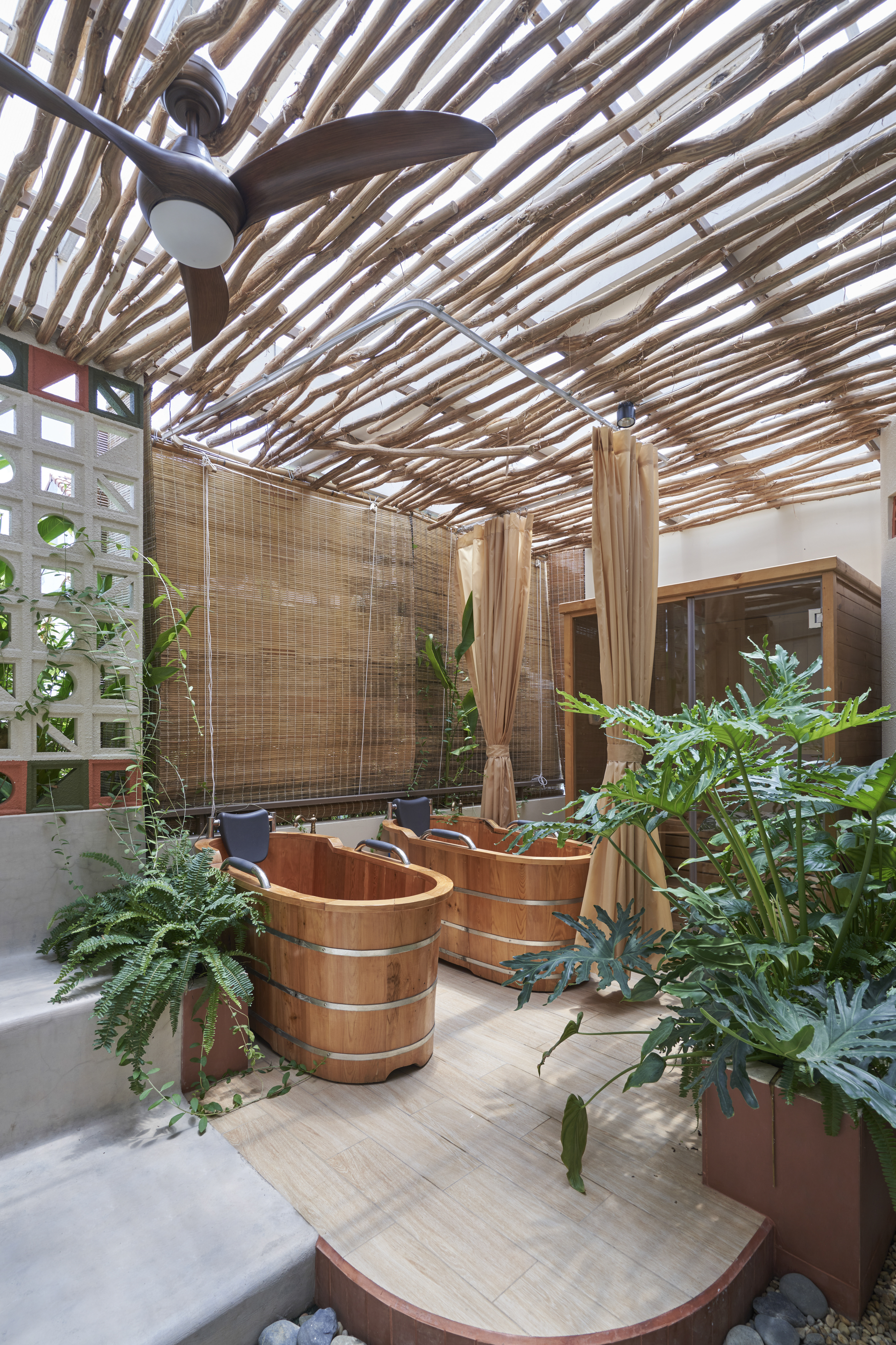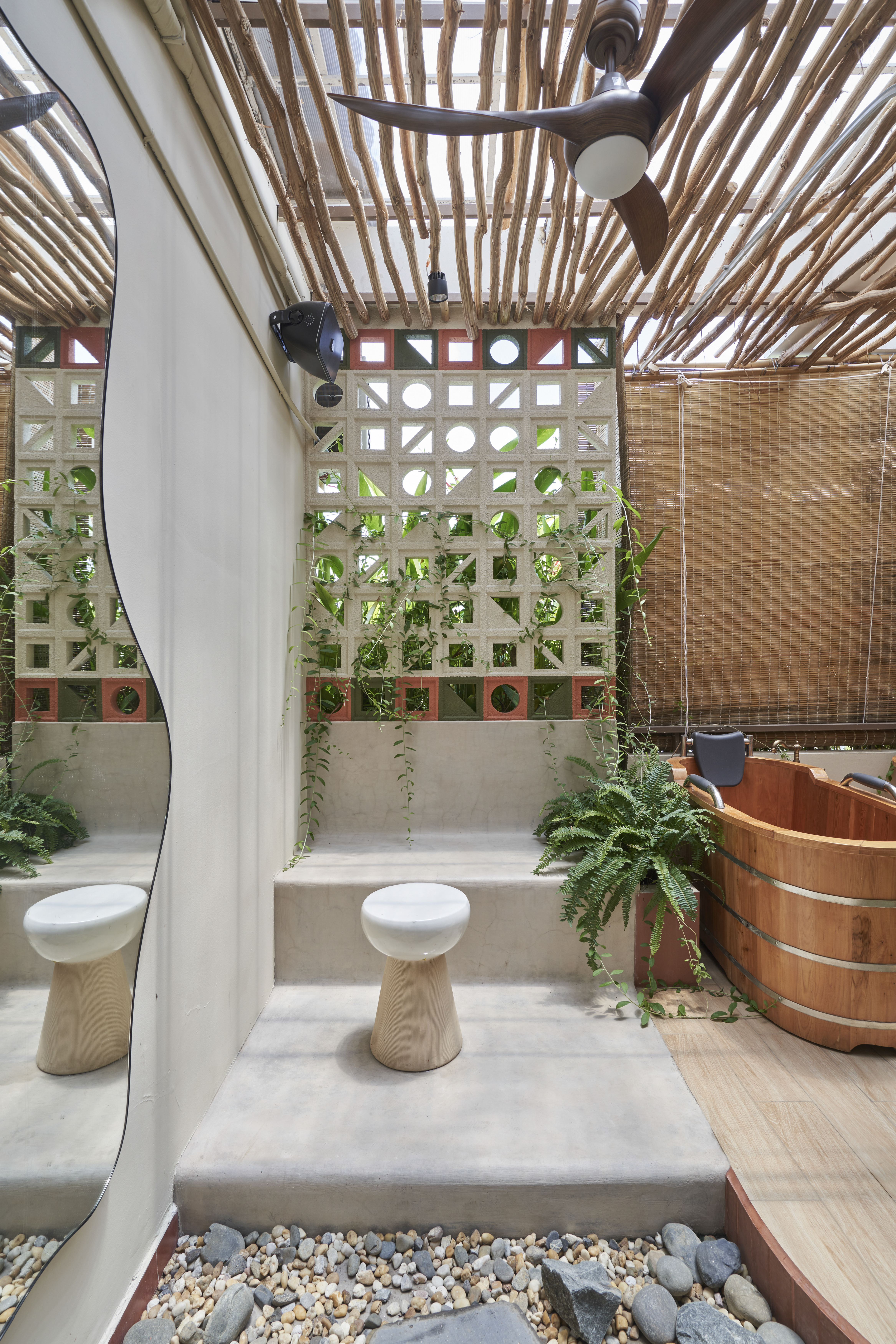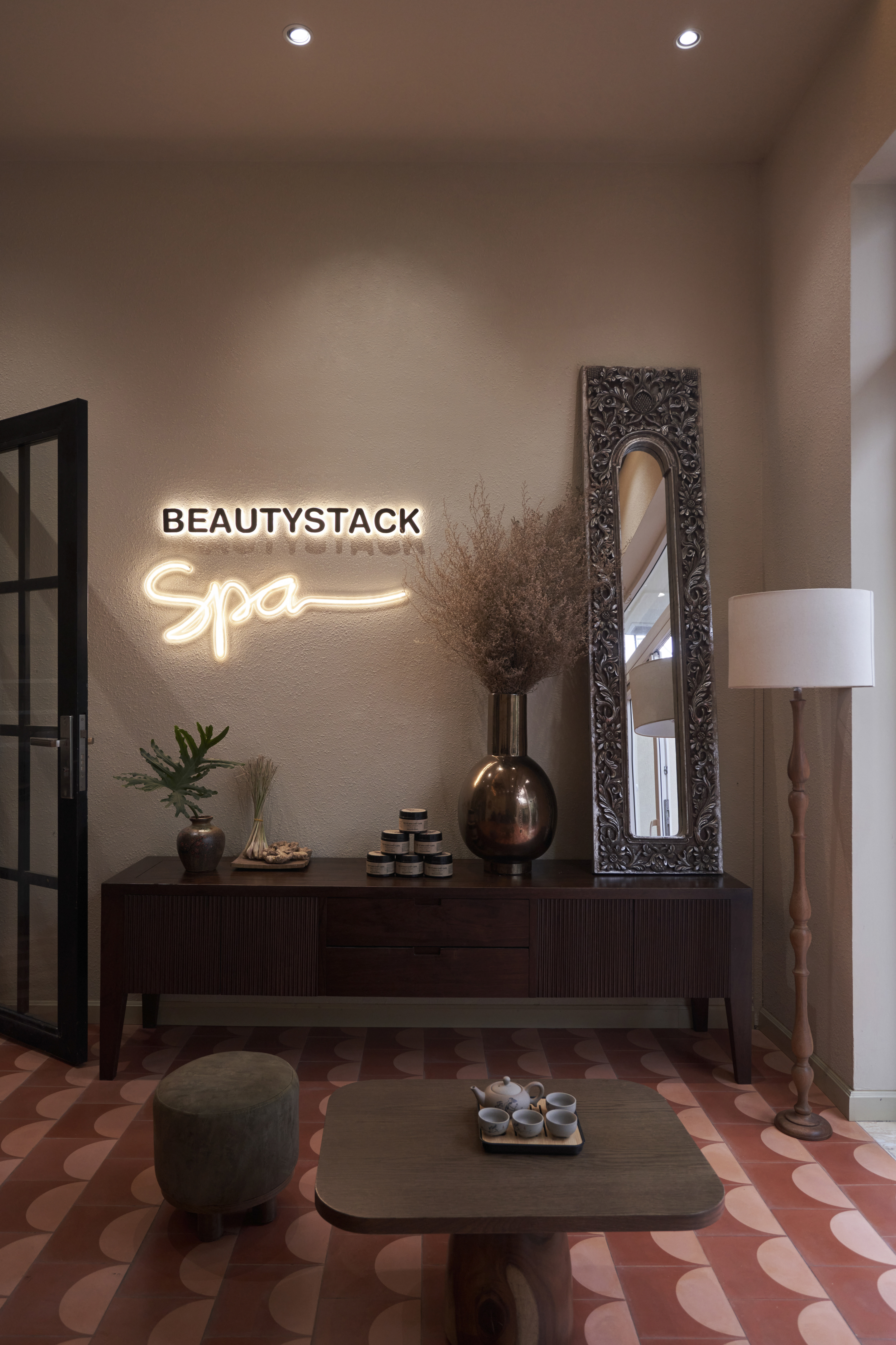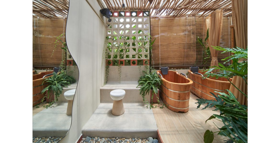 Là cơn gió mát len qua mái cây tinh tươm, là vẻ thân quen của họa tiết con tiện, là sàn nhà đỏ thắm như mái ngói và gạch thông gió vẫn ở cao tít trên bức tường trắng. Beautystack Spa qua bàn tay Leaf thi công là một không gian của sự biến tấu và tái hiện từ khung cảnh ngôi nhà có mảnh vườn và cái sân rộng của làng ta.