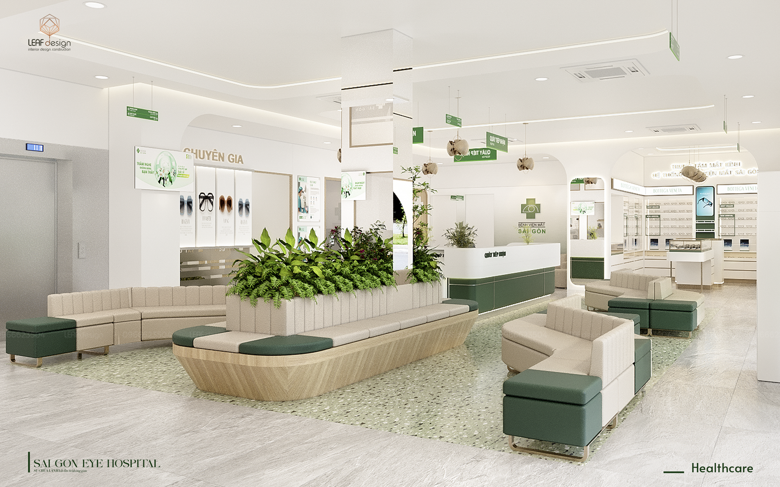 Không gian bệnh viện Mắt Sài Gòn mở ra bằng những đường cong lớn, dẫn dắt nhịp di chuyển trở nên mạch lạc và thư thái. Gam xanh – be dịu mắt hòa cùng những điểm chạm gỗ ấm tạo nên lớp nền thời thượng nhưng không phô trương, đúng tinh thần một bệnh viện hiện đại mà vẫn gần gũi. Khu vực chờ uốn mềm quanh mảng xanh tự nhiên, như gom ánh sáng và hơi thở tươi mát vào trung tâm, đem lại cảm giác cân bằng ngay khi bước vào. Từ kiến trúc đến nội thất, ngôn ngữ bo tròn được giữ nhất quán, để mỗi ánh nhìn đều chạm vào sự mềm mại. Một không gian được tạo nên để con người thả lỏng mà đôi khi không nhận ra mình đang thả lỏng.