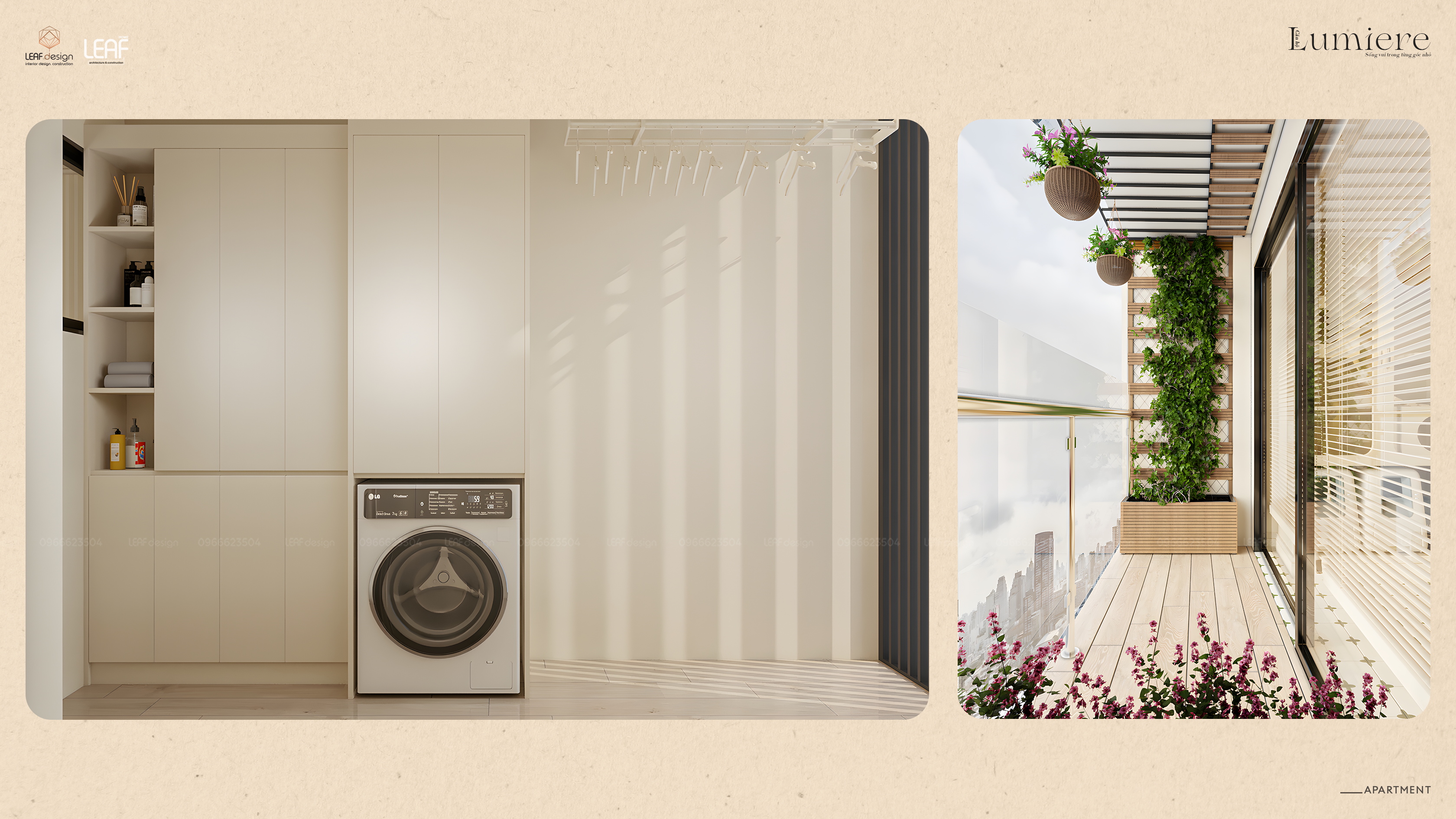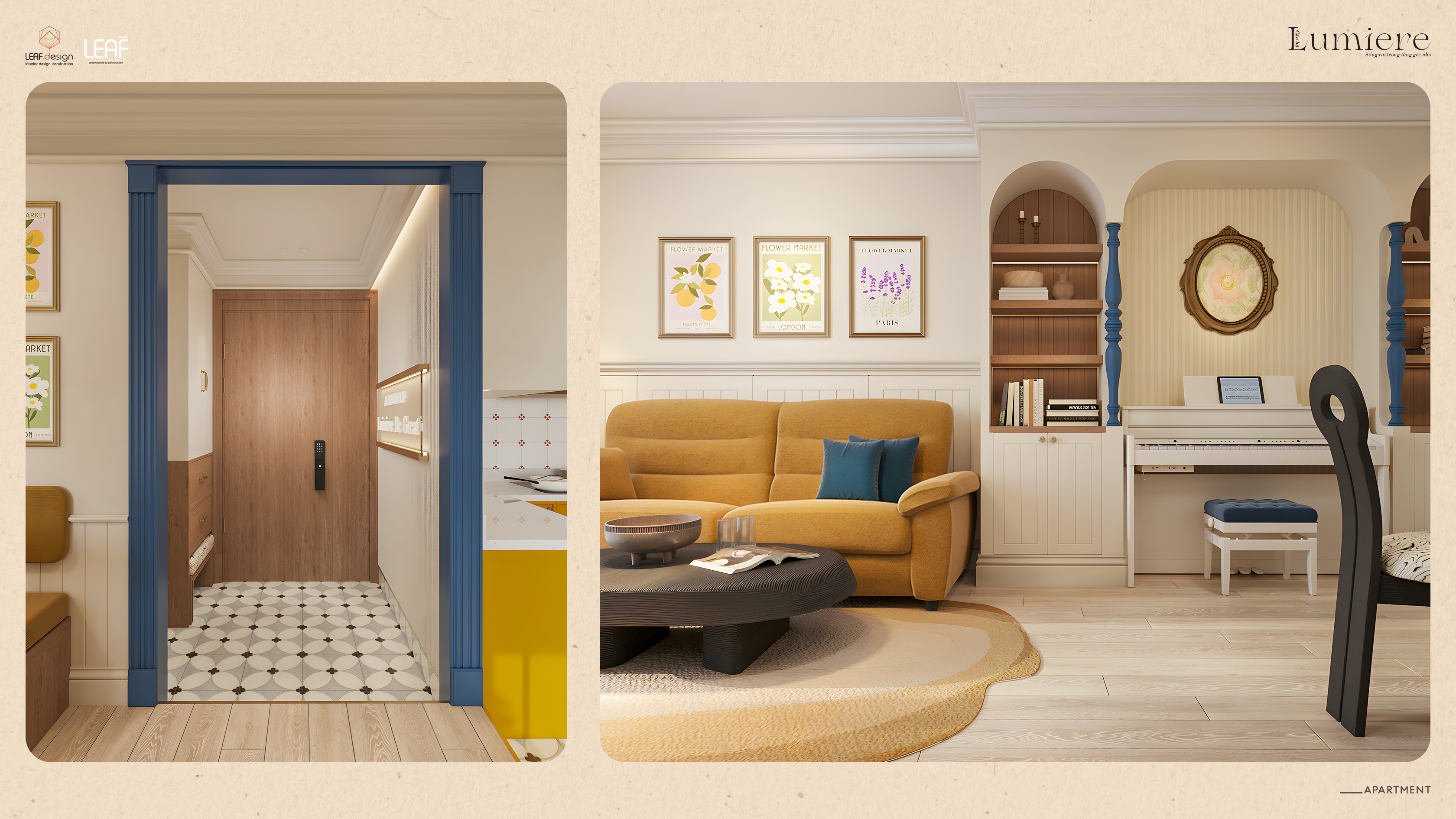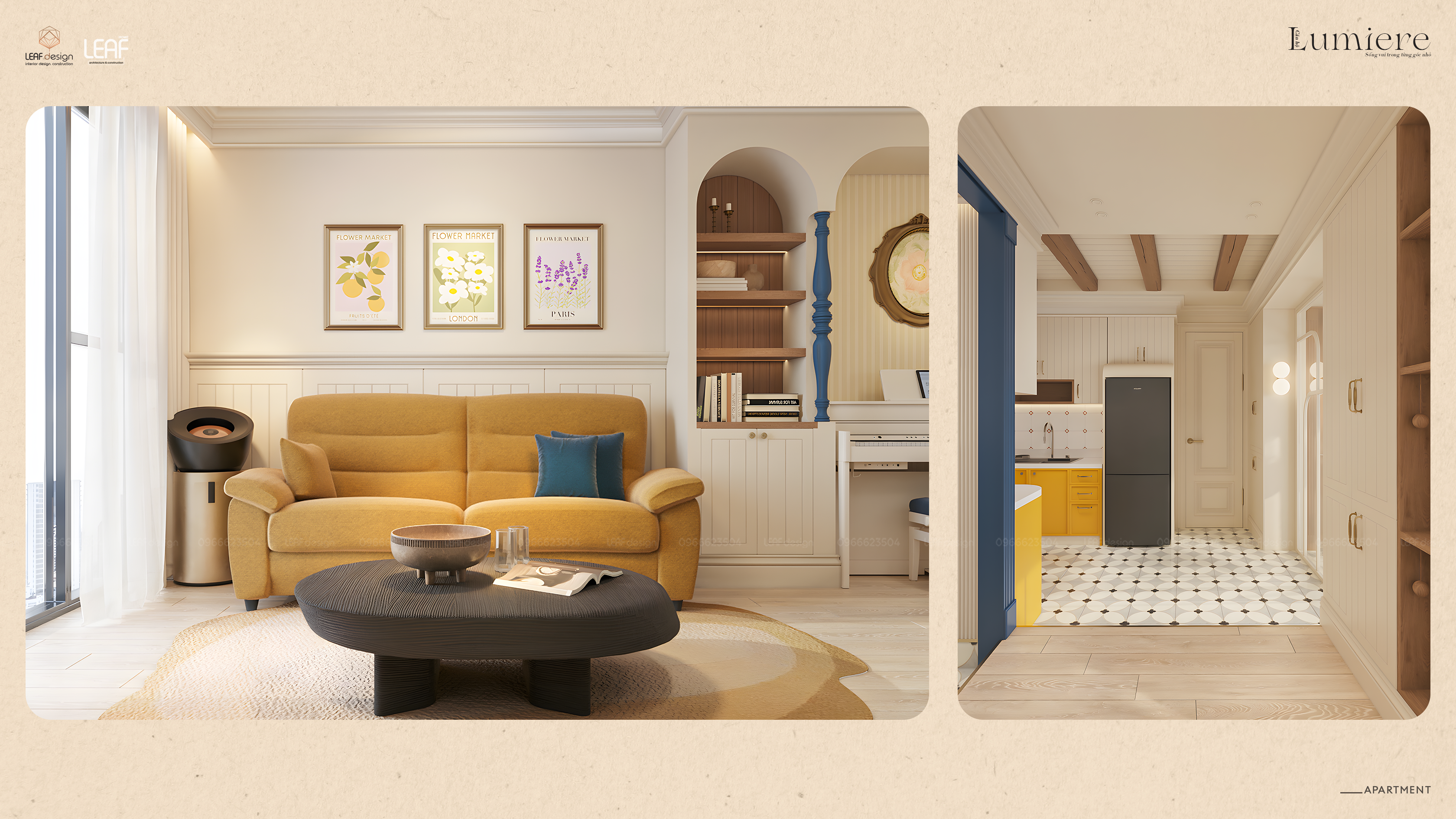 Lumiere là một căn hộ mang tinh thần cởi mở và nhiều năng lượng tích cực. Ánh sáng tràn vào đầy đặn, màu sắc được sử dụng vừa tay nhưng đủ vui để không gian luôn có sức sống.