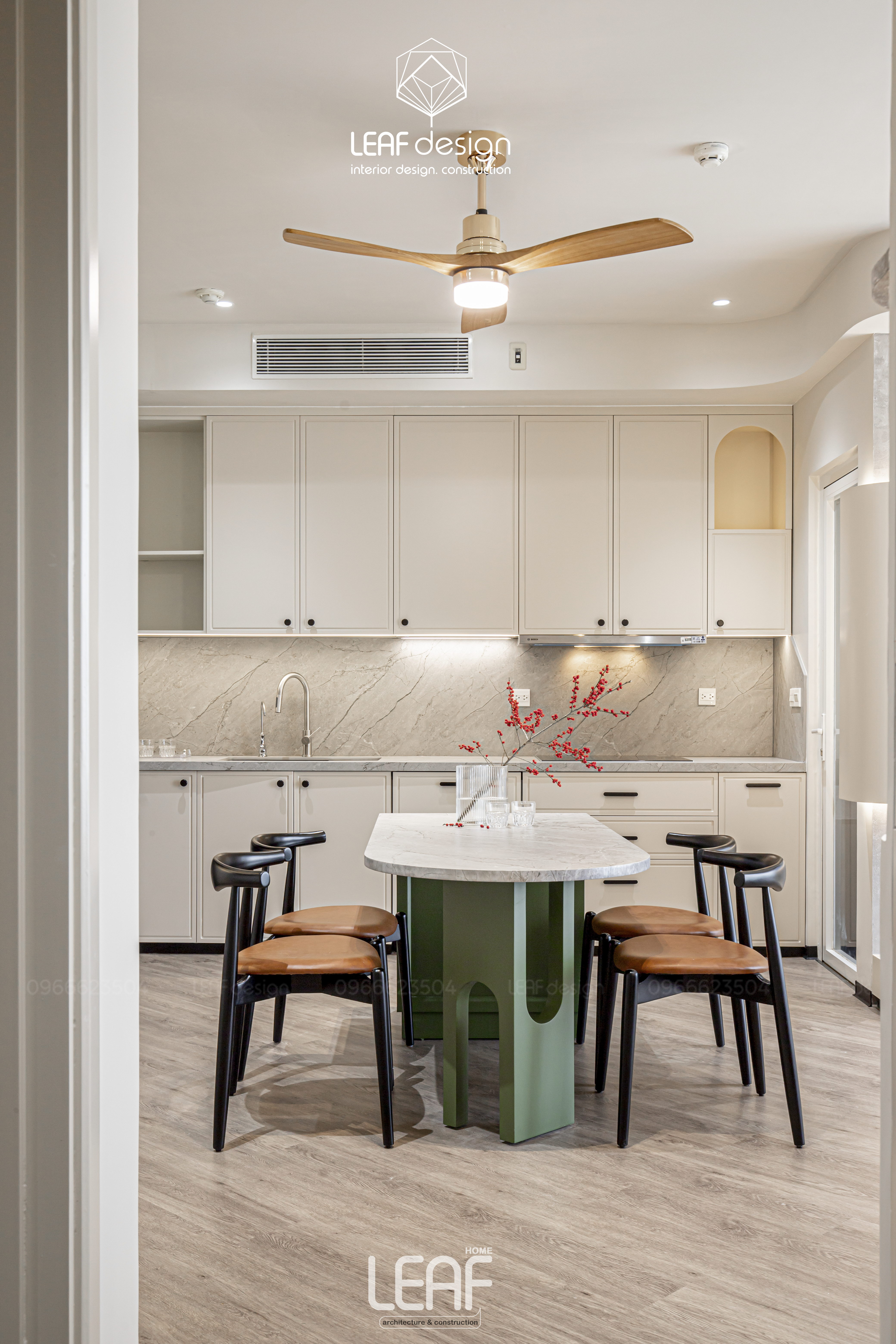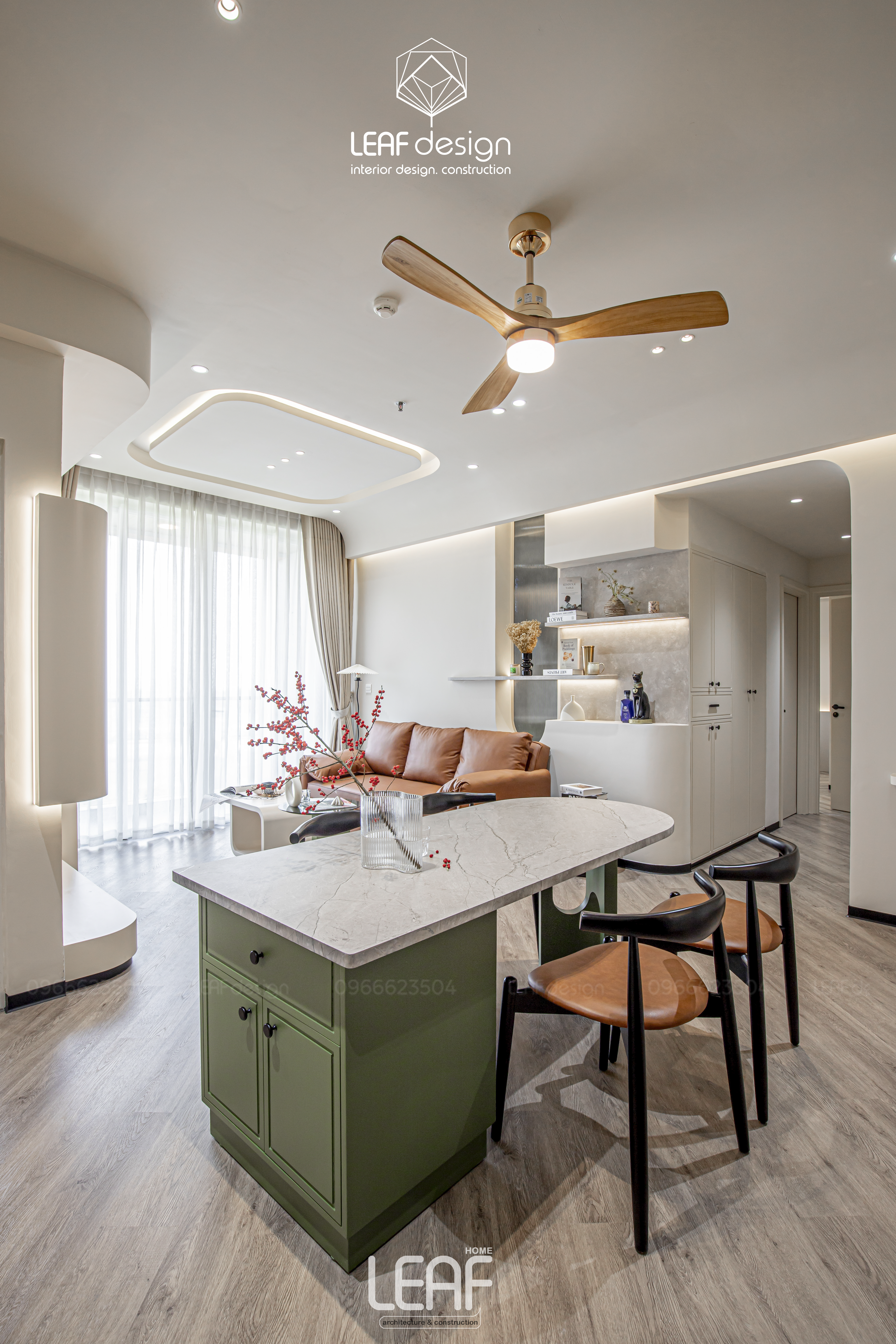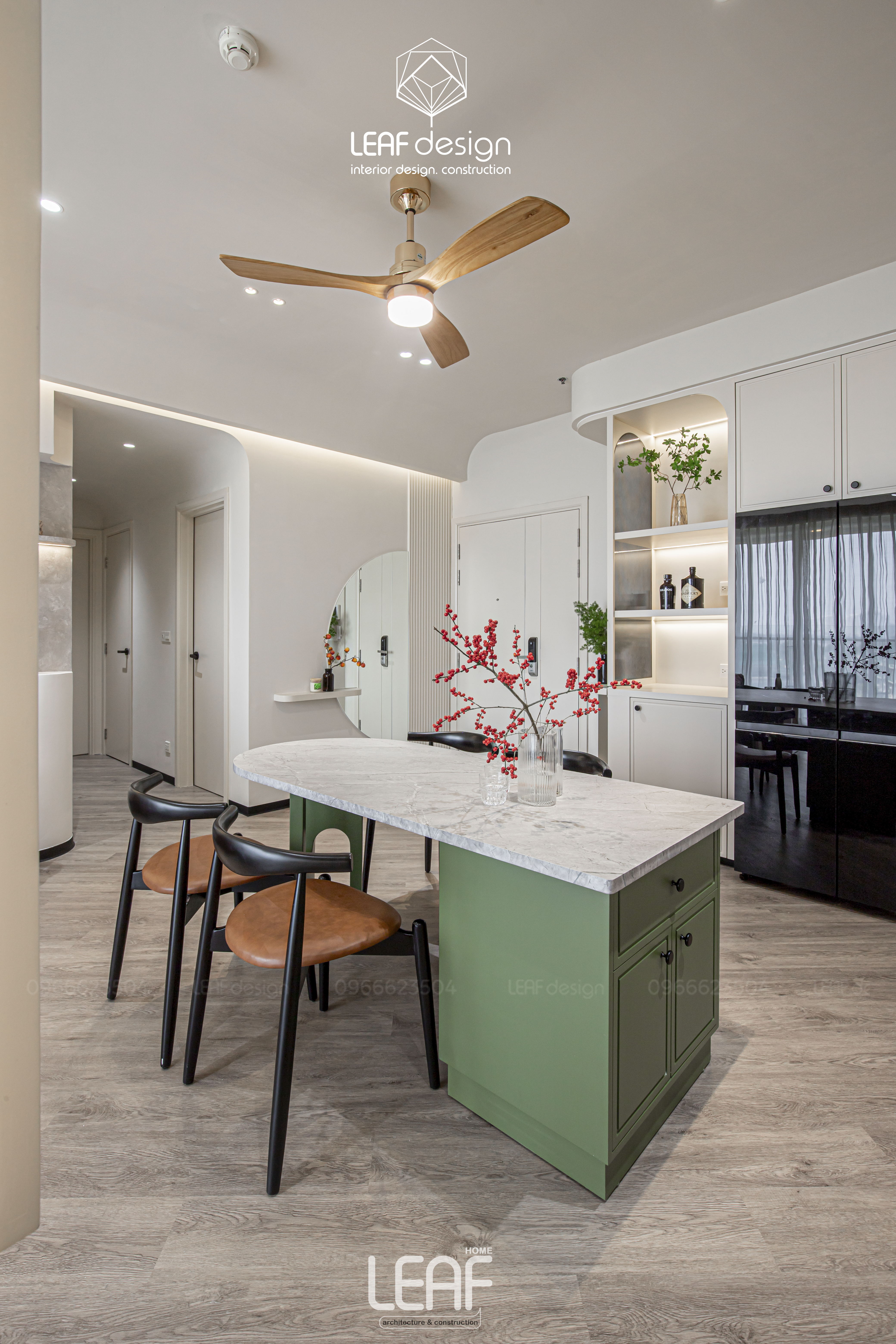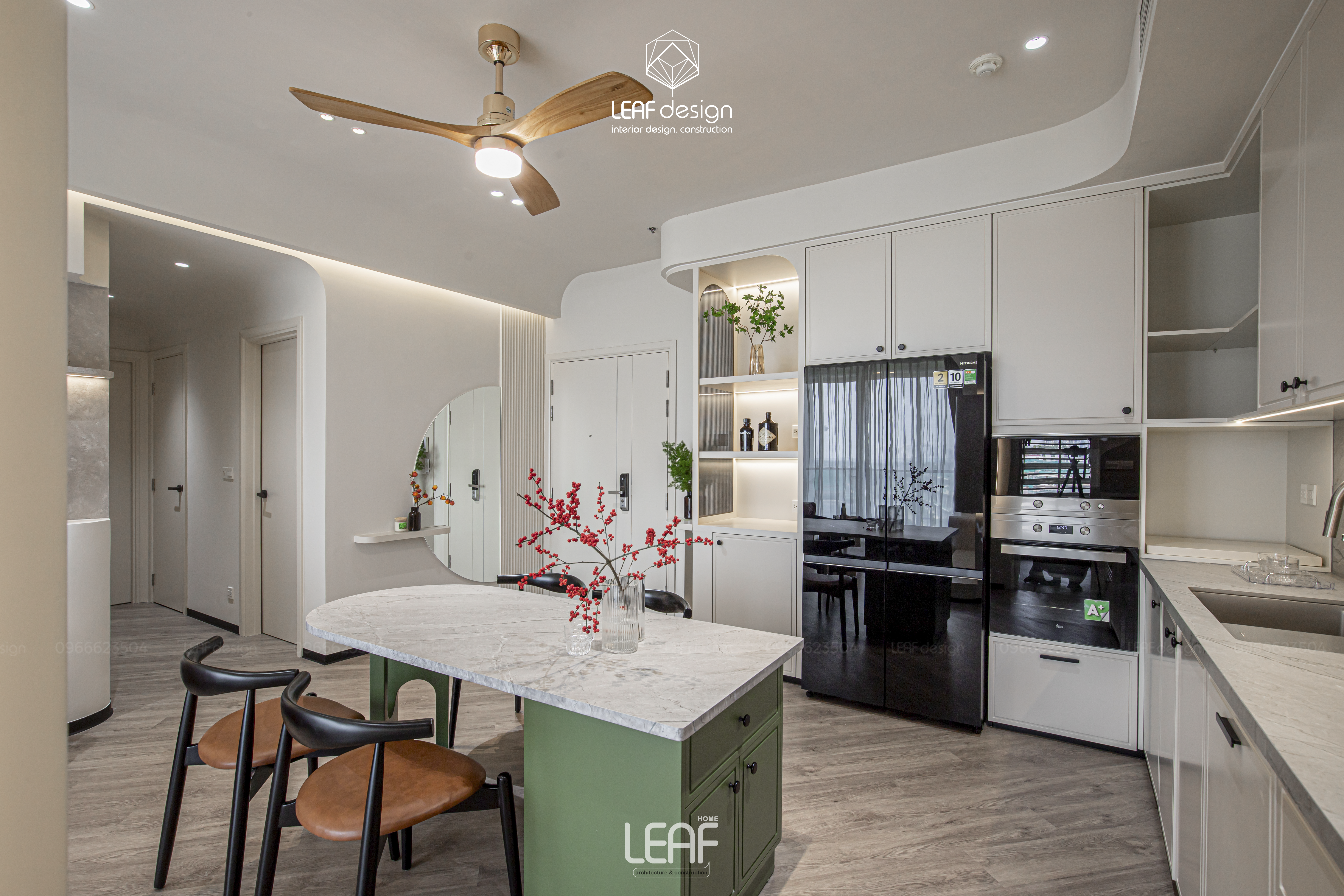 Đó là ngôi nhà phủ màu trắng sữa trong veo, hoạ điểm những mảng xanh tươi mát rất hồn nhiên. Khu đảo bếp tinh khôi mang đường nét hiện đại, được hoàn thiện sắc sảo trên chất liệu gỗ, đá marble. Đường cong mượt mà của nếp tường, khuôn bàn, dáng tủ đem đến vẻ điềm nhiên sang trọng cho không gian. Nếu phòng ngủ của bé tràn đầy nét ngọt ngào, thì không gian riêng của gia chủ lại toát lên cá tính mạnh mẽ trong tông xám trắng tinh giản. Không chỉ kiến tạo nên một cấu trúc đẹp, Leaf còn chăm chút từng chi tiết nội thất, từ thiết kế đến chế tác để để có thể tạo nên một ngôi nhà bền bỉ, êm từng góc nhỏ.