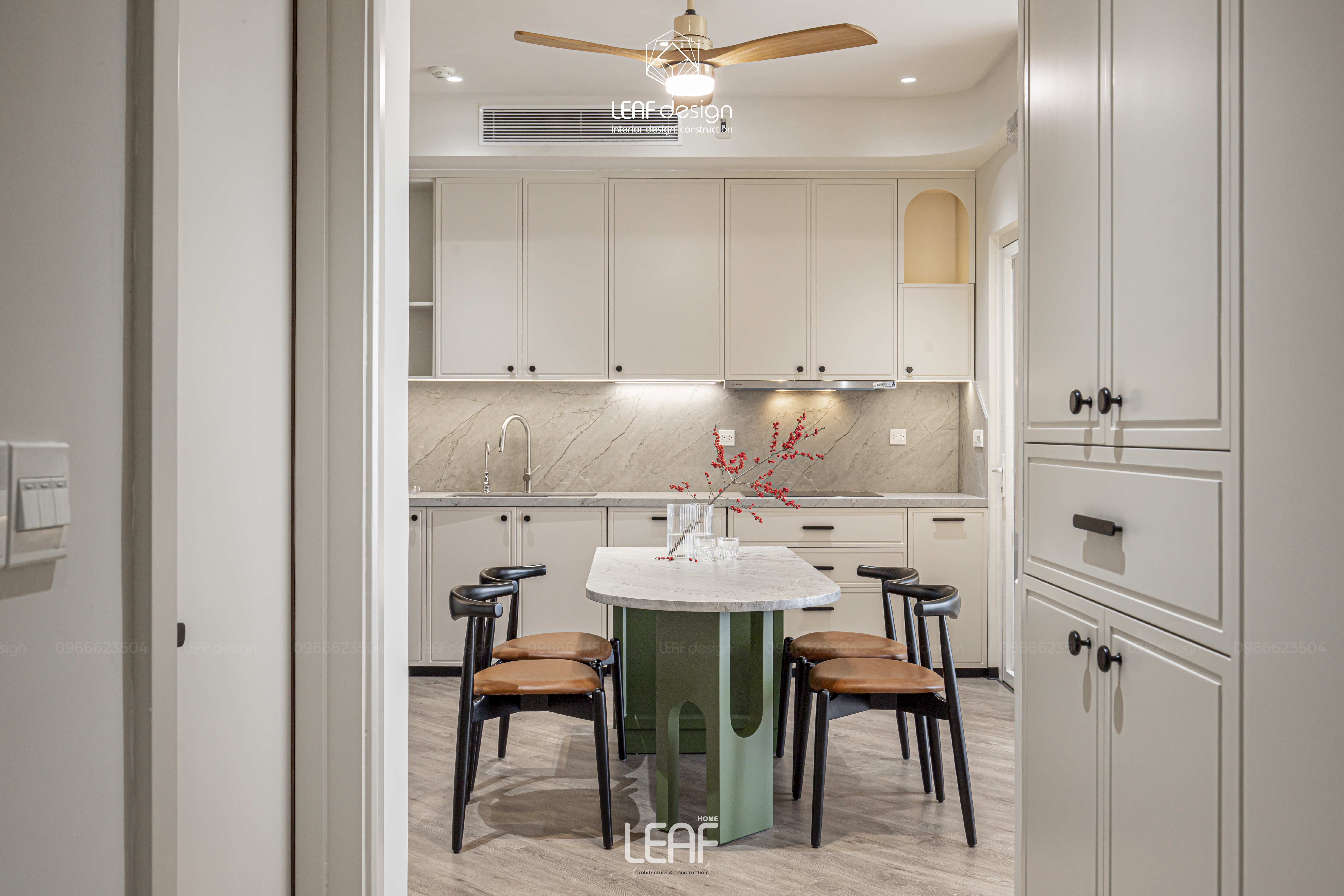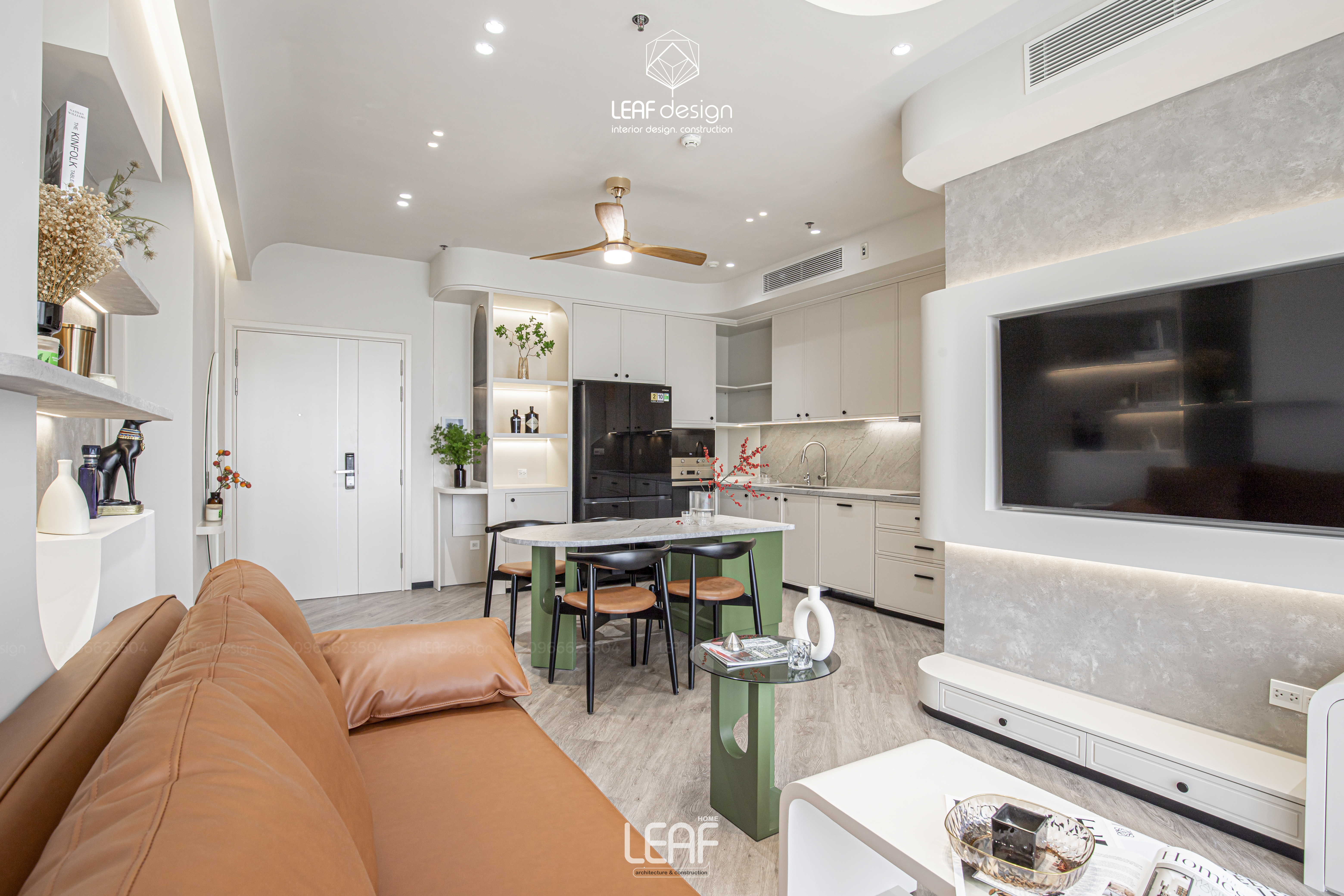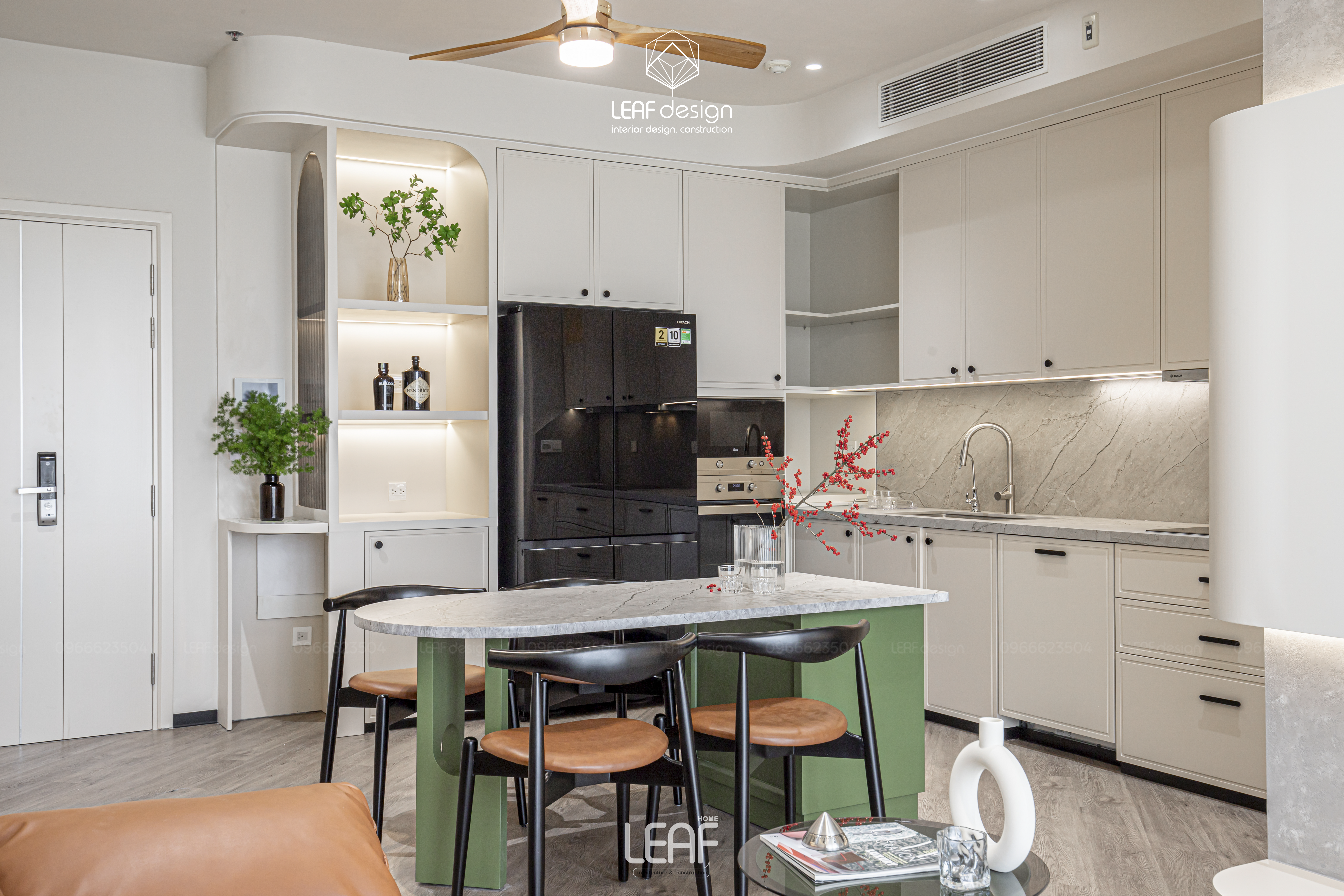 Đó là ngôi nhà phủ màu trắng sữa trong veo, hoạ điểm những mảng xanh tươi mát rất hồn nhiên. Khu đảo bếp tinh khôi mang đường nét hiện đại, được hoàn thiện sắc sảo trên chất liệu gỗ, đá marble. Đường cong mượt mà của nếp tường, khuôn bàn, dáng tủ đem đến vẻ điềm nhiên sang trọng cho không gian. Nếu phòng ngủ của bé tràn đầy nét ngọt ngào, thì không gian riêng của gia chủ lại toát lên cá tính mạnh mẽ trong tông xám trắng tinh giản. Không chỉ kiến tạo nên một cấu trúc đẹp, Leaf còn chăm chút từng chi tiết nội thất, từ thiết kế đến chế tác để để có thể tạo nên một ngôi nhà bền bỉ, êm từng góc nhỏ.