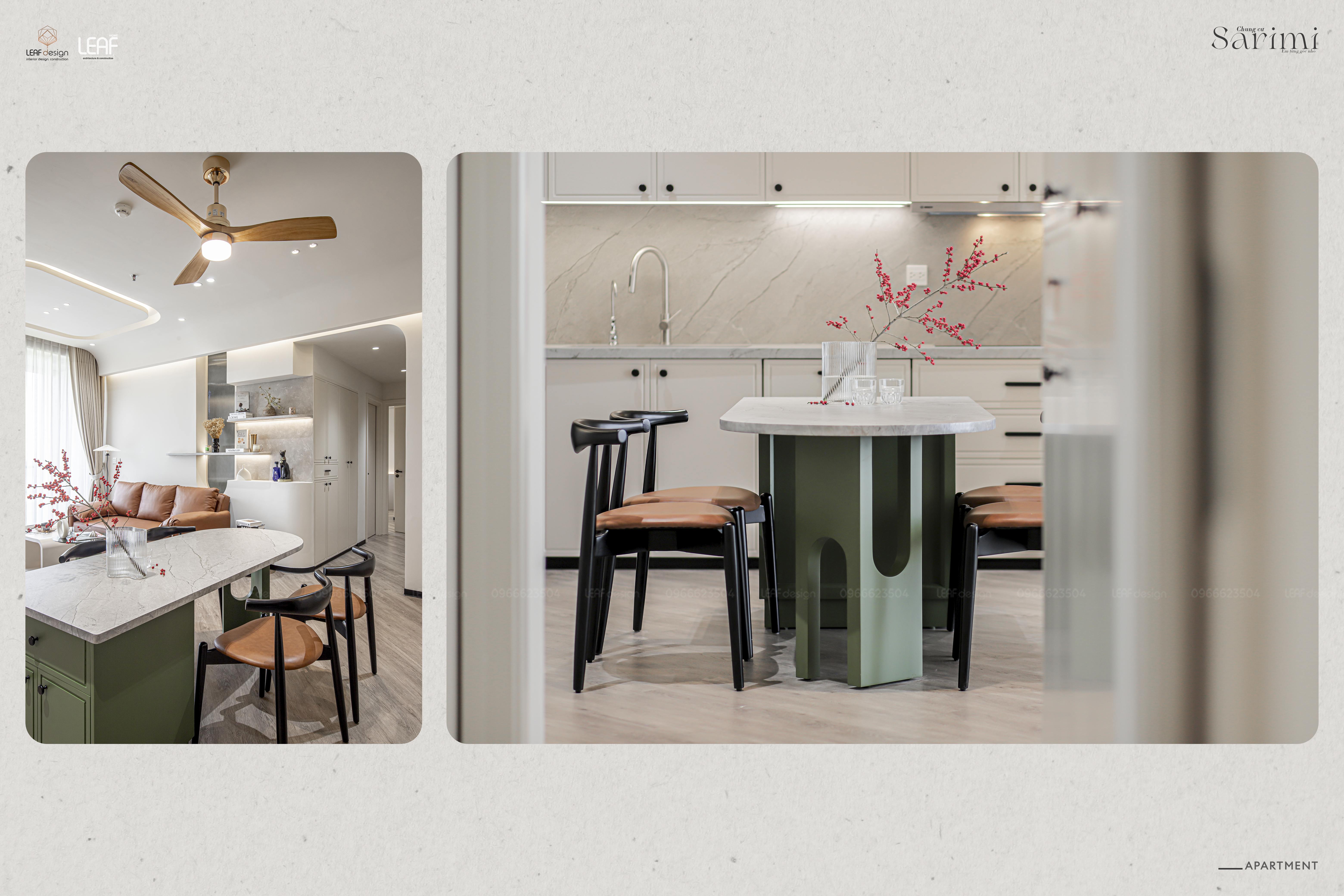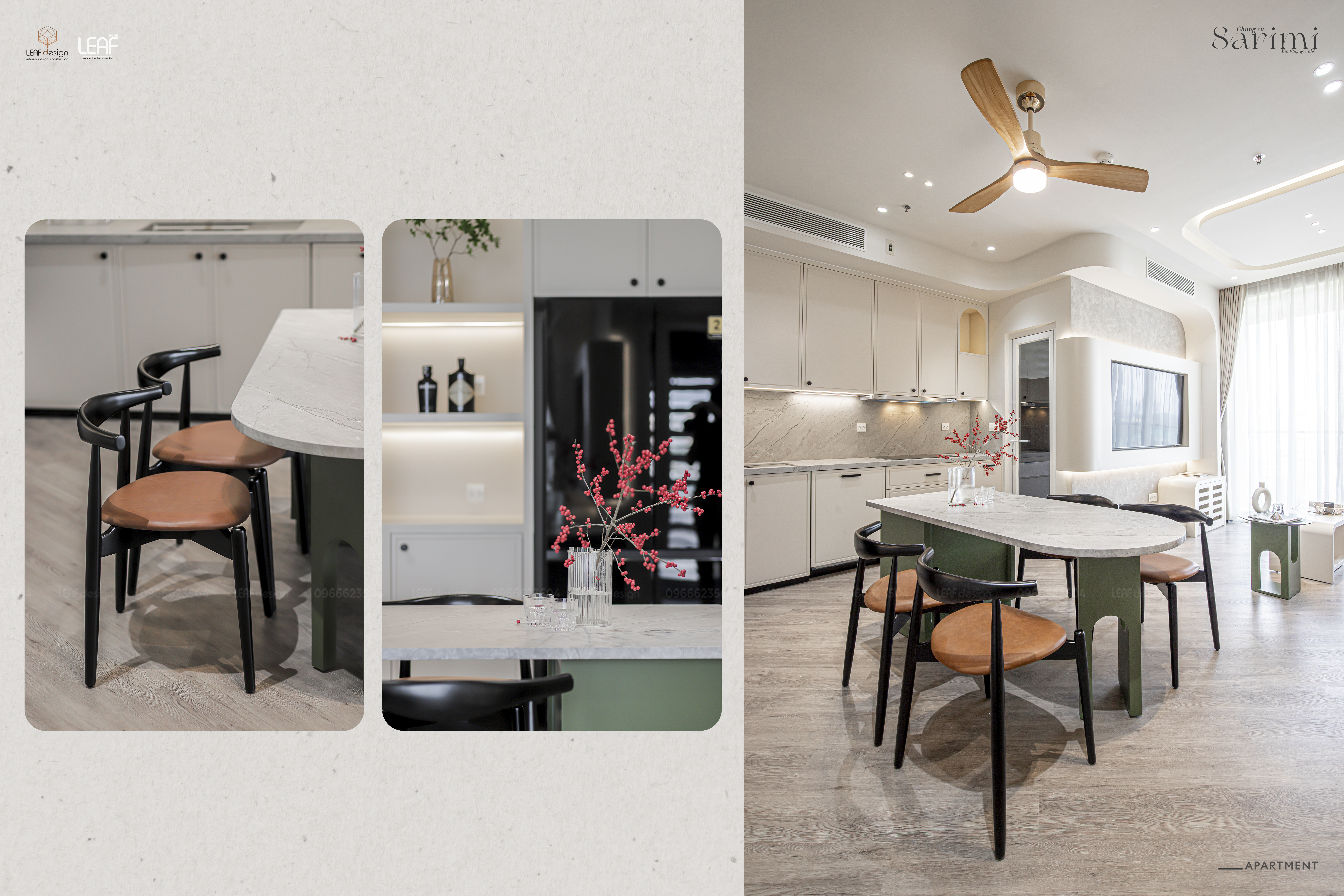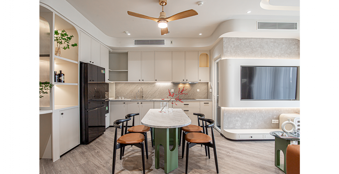 This home is wrapped in a pure milky-white palette, accented with fresh, playful touches of green. The pristine kitchen island carries modern lines, finely crafted in wood and marble. Gentle curves in the walls, tabletop, and cabinetry bring a calm, understated elegance to the space.