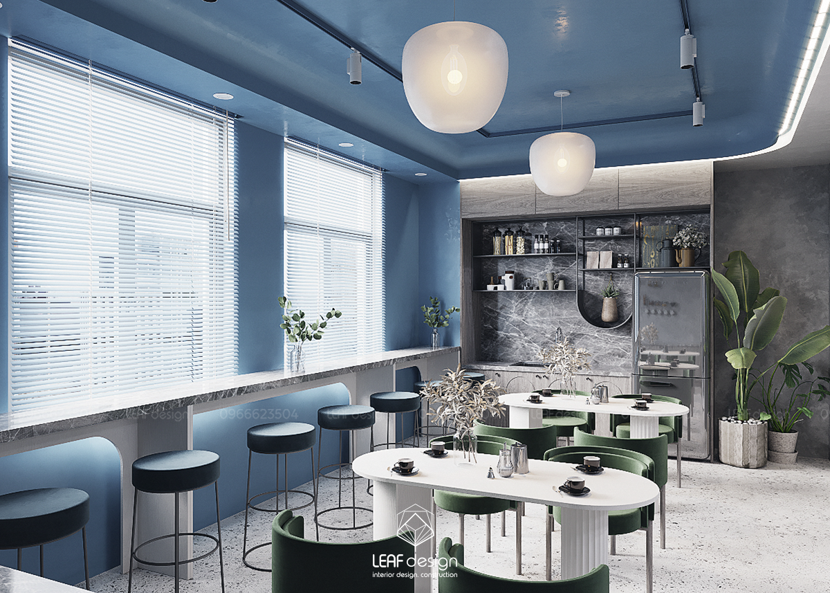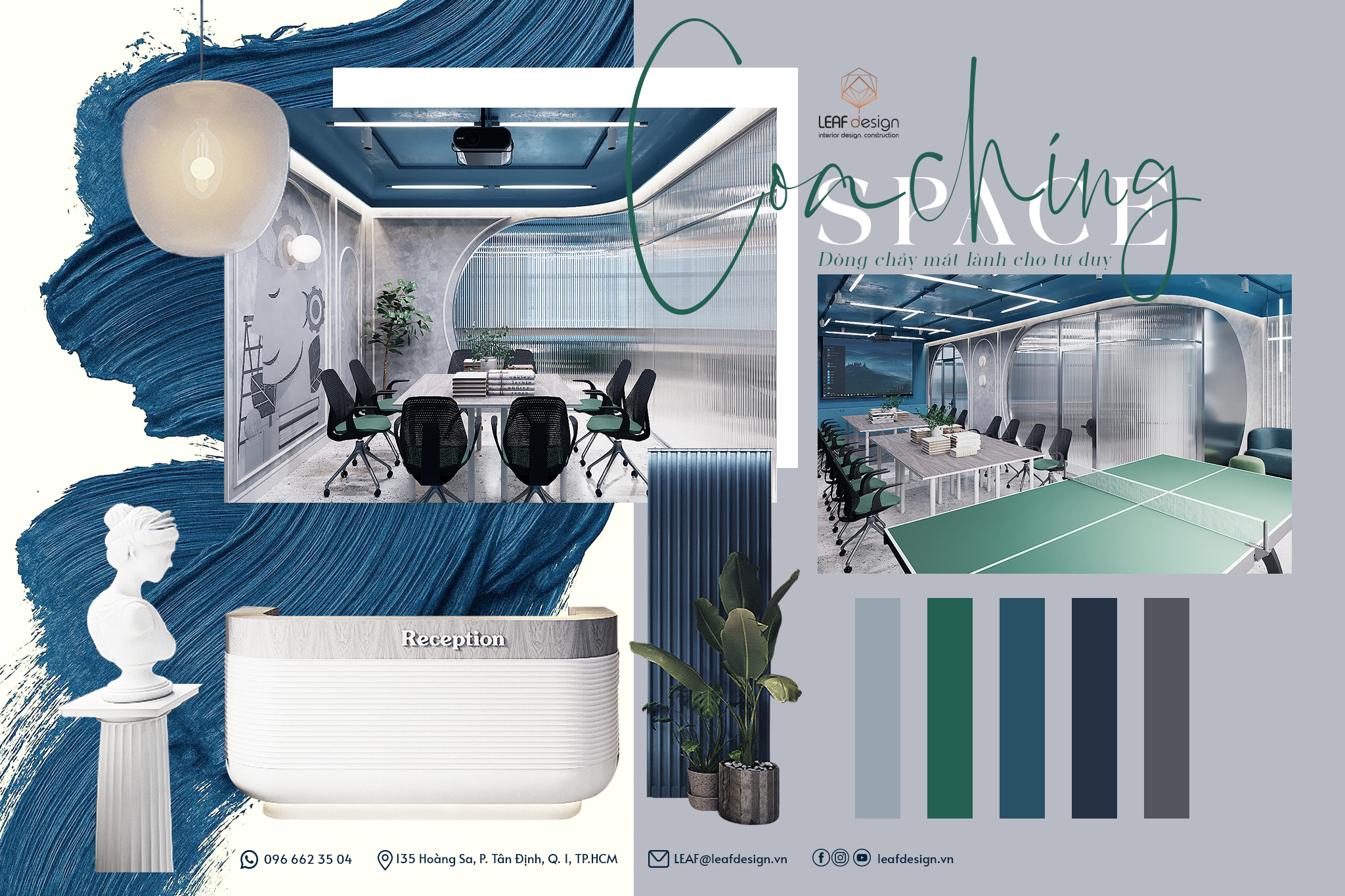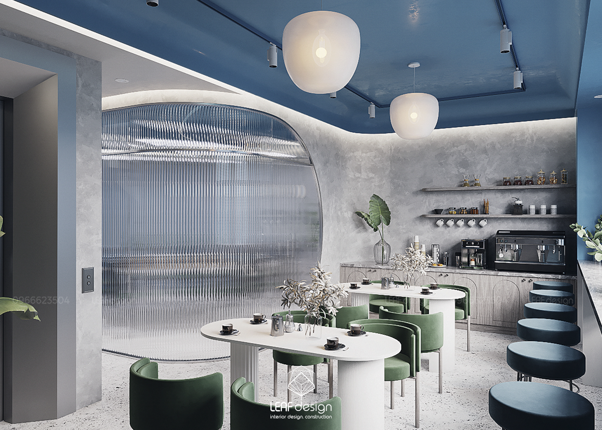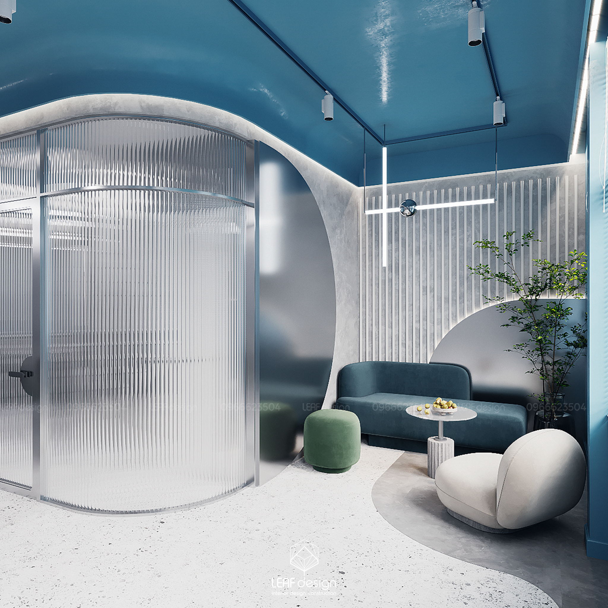 Tựa mặt nước phẳng lặng phản chiếu những ý niệm đang hình thành, có khi lấp lánh những mảng bạc của kính vân, có lúc sâu thẳm trong gam xanh biếc nhẵn mịn. Ánh sáng tự nhiên chạm vào từng lớp vật liệu, tạo nên chuyển động nhẹ nhàng theo thời gian, trong khi gỗ sáng neo lại cảm giác gần gũi ấm áp. Mang dáng dấp của biển nhưng không gian ấy vẫn giữ một trật tự rất đời, ghế bàn ngay ngắn là điểm khởi đầu, và mỗi bước tiến đều mở ra những khoảng dừng tự do.