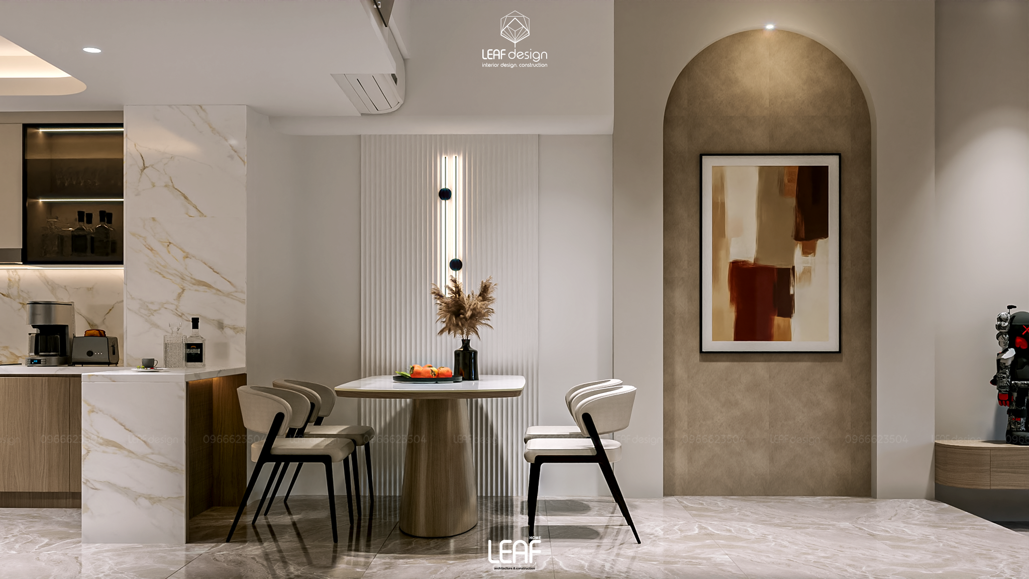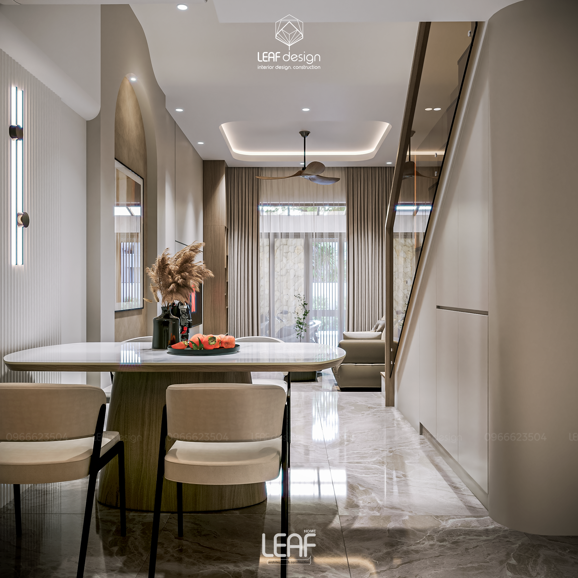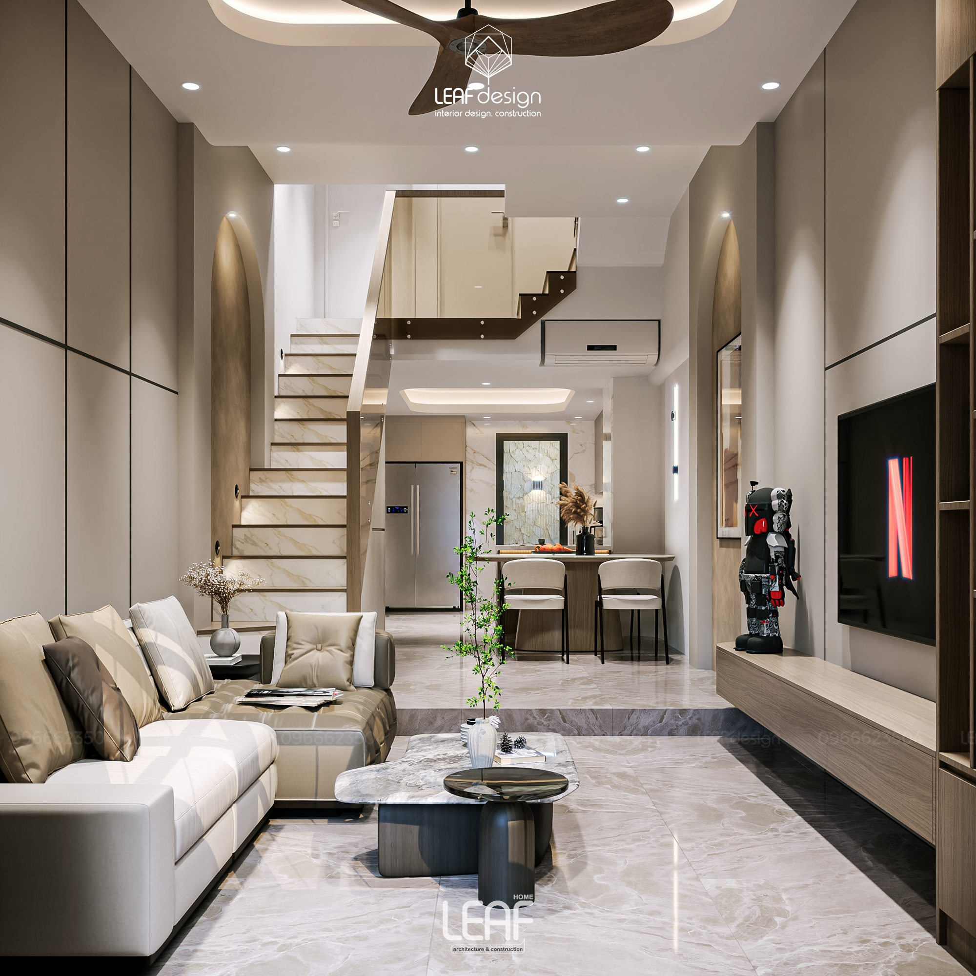 Ngôi nhà mang tinh thần đương đại, với sự sang trọng được thể hiện tinh tế qua vân đá, sắc gỗ nâu, mảng kính lớn trên nền màu trung tính dịu nhẹ. Không gian được tổ chức liền mạch, phòng khách, bếp và các góc nhỏ kết nối tự nhiên, tạo cảm giác thoáng đãng và dễ chịu trong từng nhịp sinh hoạt.