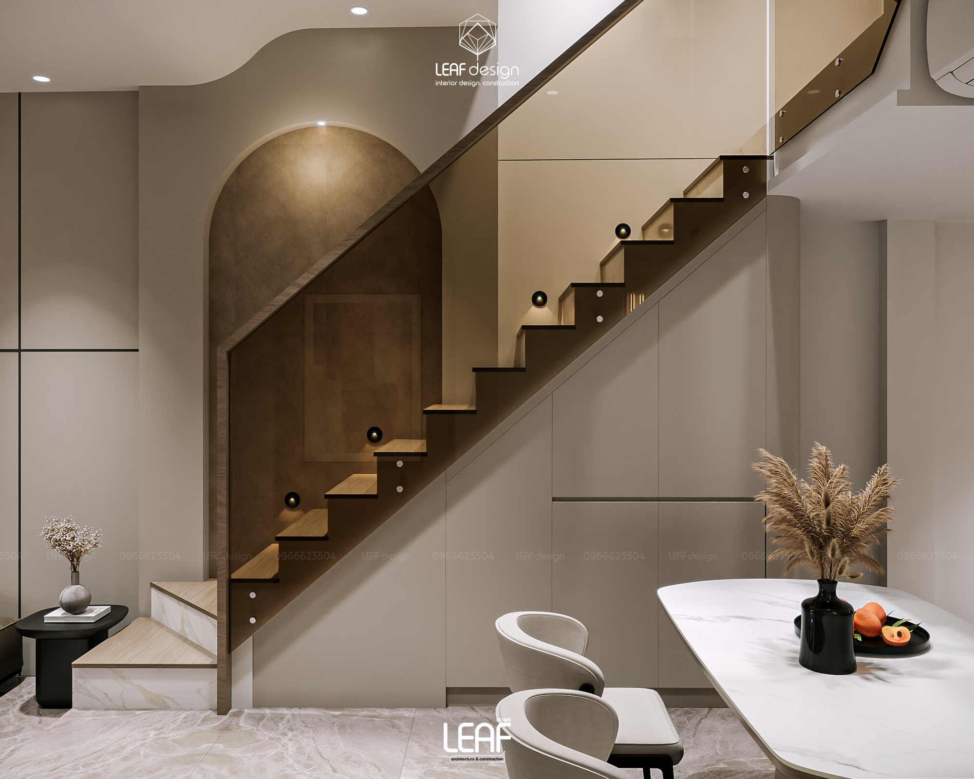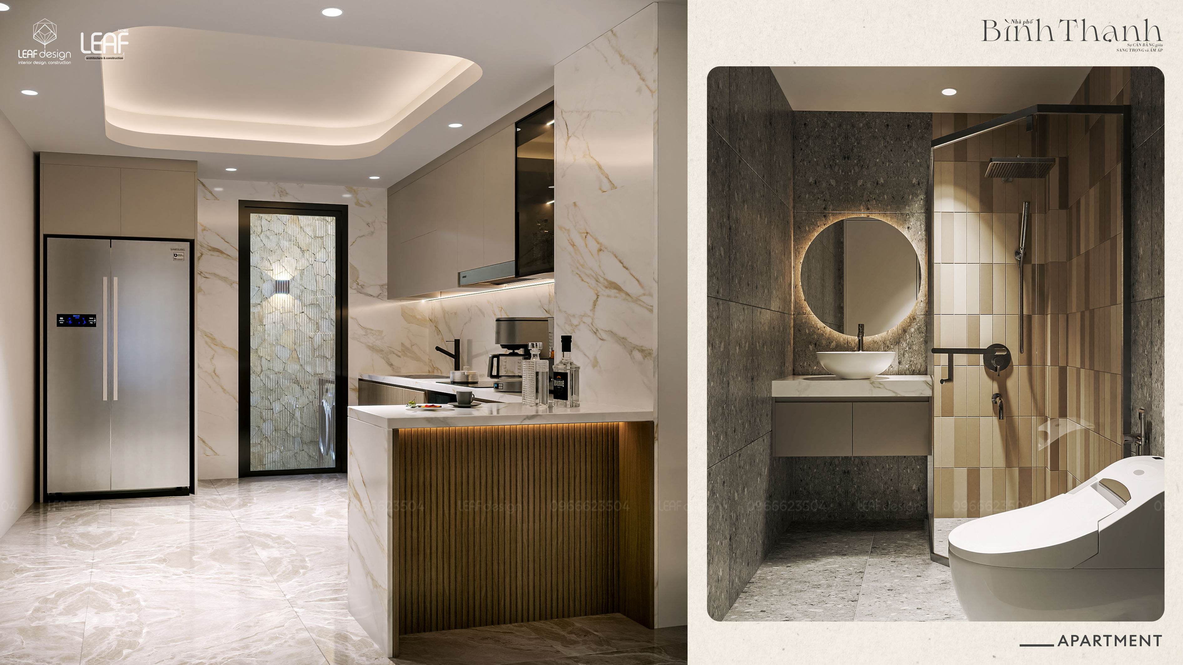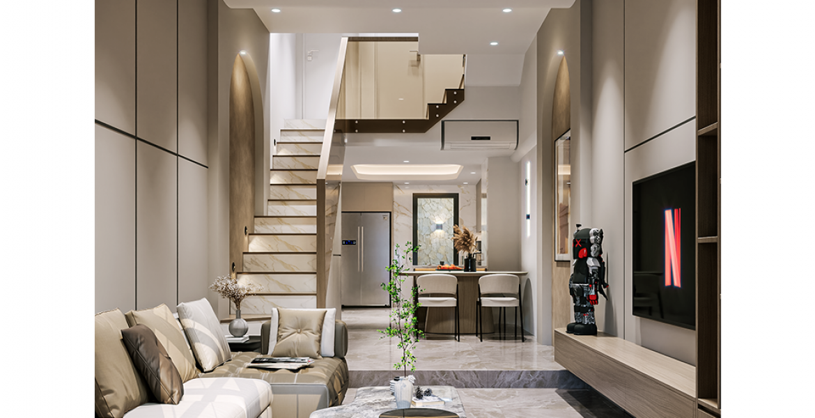 Ngôi nhà mang tinh thần đương đại, với sự sang trọng được thể hiện tinh tế qua vân đá, sắc gỗ nâu, mảng kính lớn trên nền màu trung tính dịu nhẹ. Không gian được tổ chức liền mạch, phòng khách, bếp và các góc nhỏ kết nối tự nhiên, tạo cảm giác thoáng đãng và dễ chịu trong từng nhịp sinh hoạt.