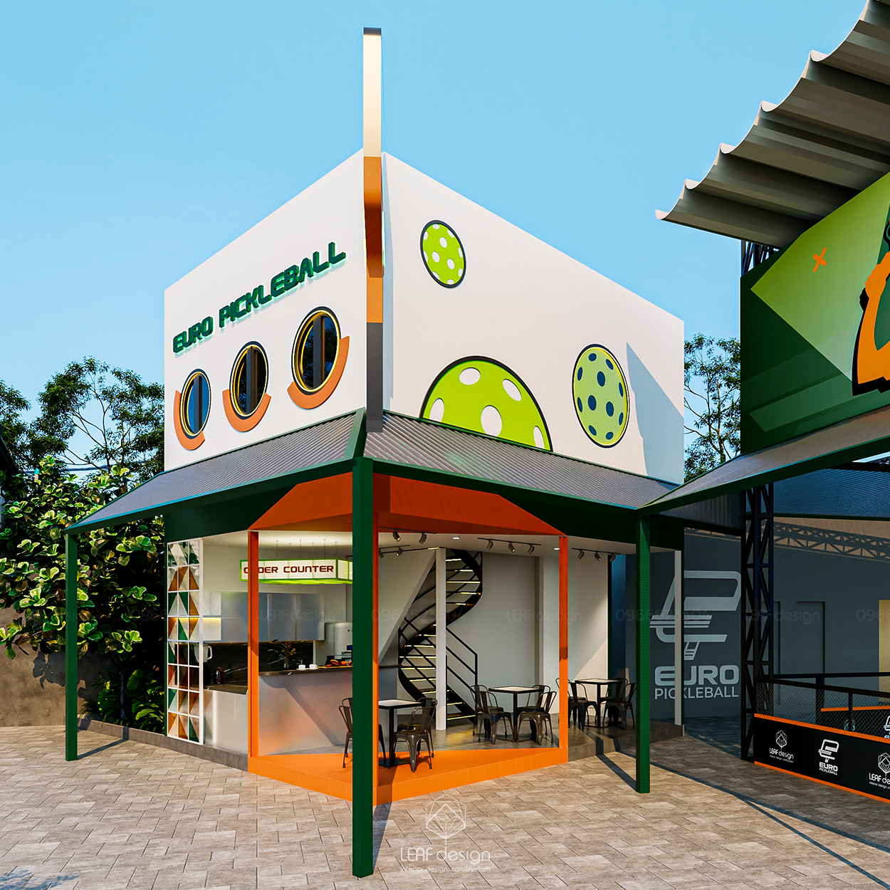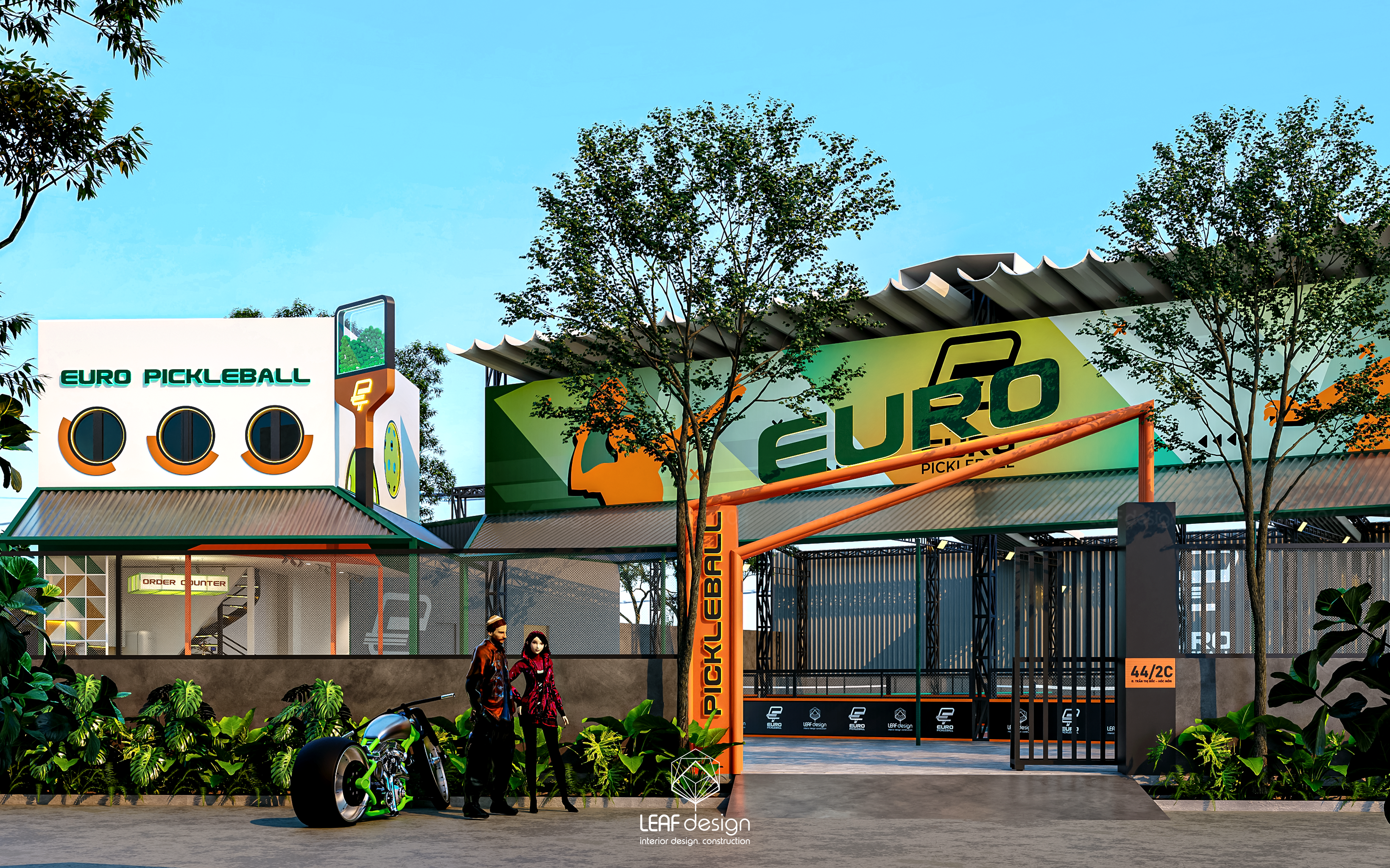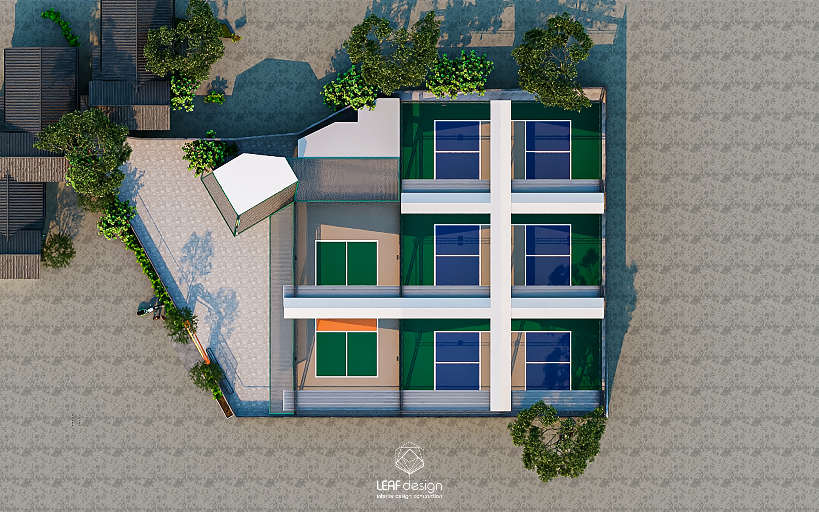 Ô cửa tròn trên biển hiệu gợi lên một chuyển động quen, như trái bóng lăn qua không gian, làm dịu đi những hình khối thể thao nhiều kết cấu. Sắc xanh, cam và trắng xuất hiện đều tay tạo thành điểm nhấn tươi vui và hiện đại. Dưới nắng ngày, lớp mái poly dọc lối đi tạo nên những khoảng bóng đổ rất dịu để chuyển động diễn ra thong thả hơn. Xen giữa các lớp không gian, mảng xanh xuất hiện như một nhịp nghỉ tự nhiên, giữ lại cảm giác thoải mái và liền mạch cho suốt cuộc chơi.